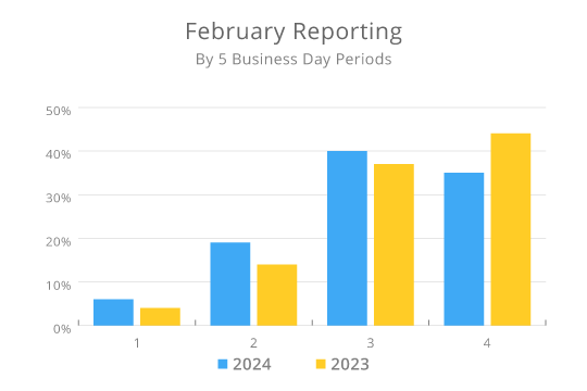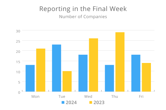An examination of the weekly distribution of reporting this year compared to 2023 highlights a distinct shift towards earlier reporting, with an increased number of reports in Weeks 1 and 2 (24%) compared with 2023 (16%). Week 3 replaced Week 4 as the most popular with 40% of companies reporting that week compared to 2023 when 44% of companies reported in the last week.